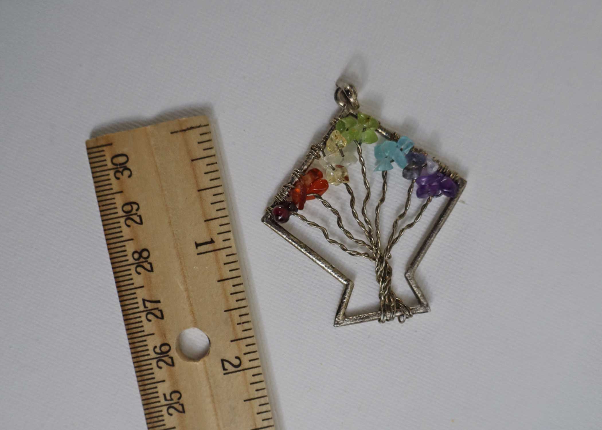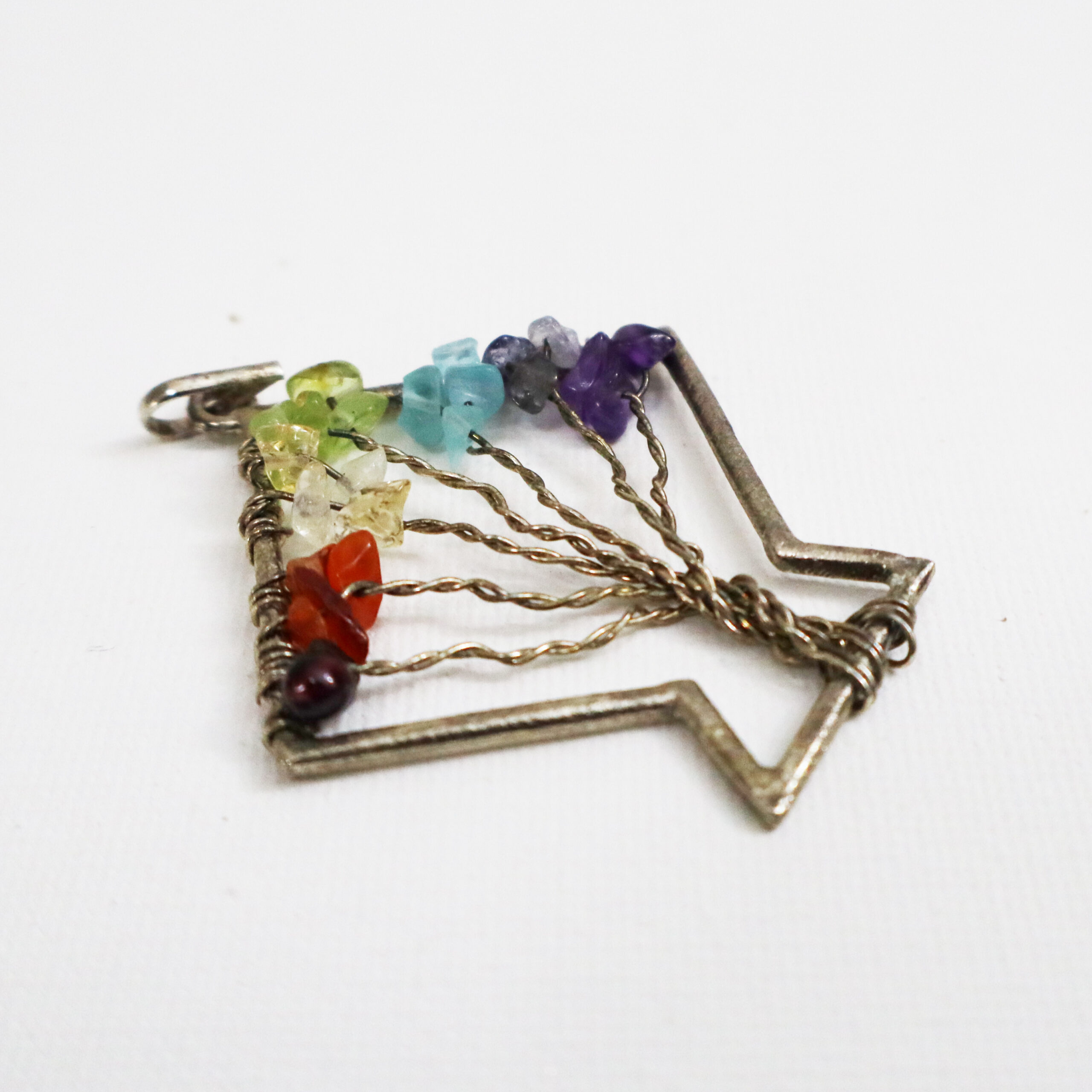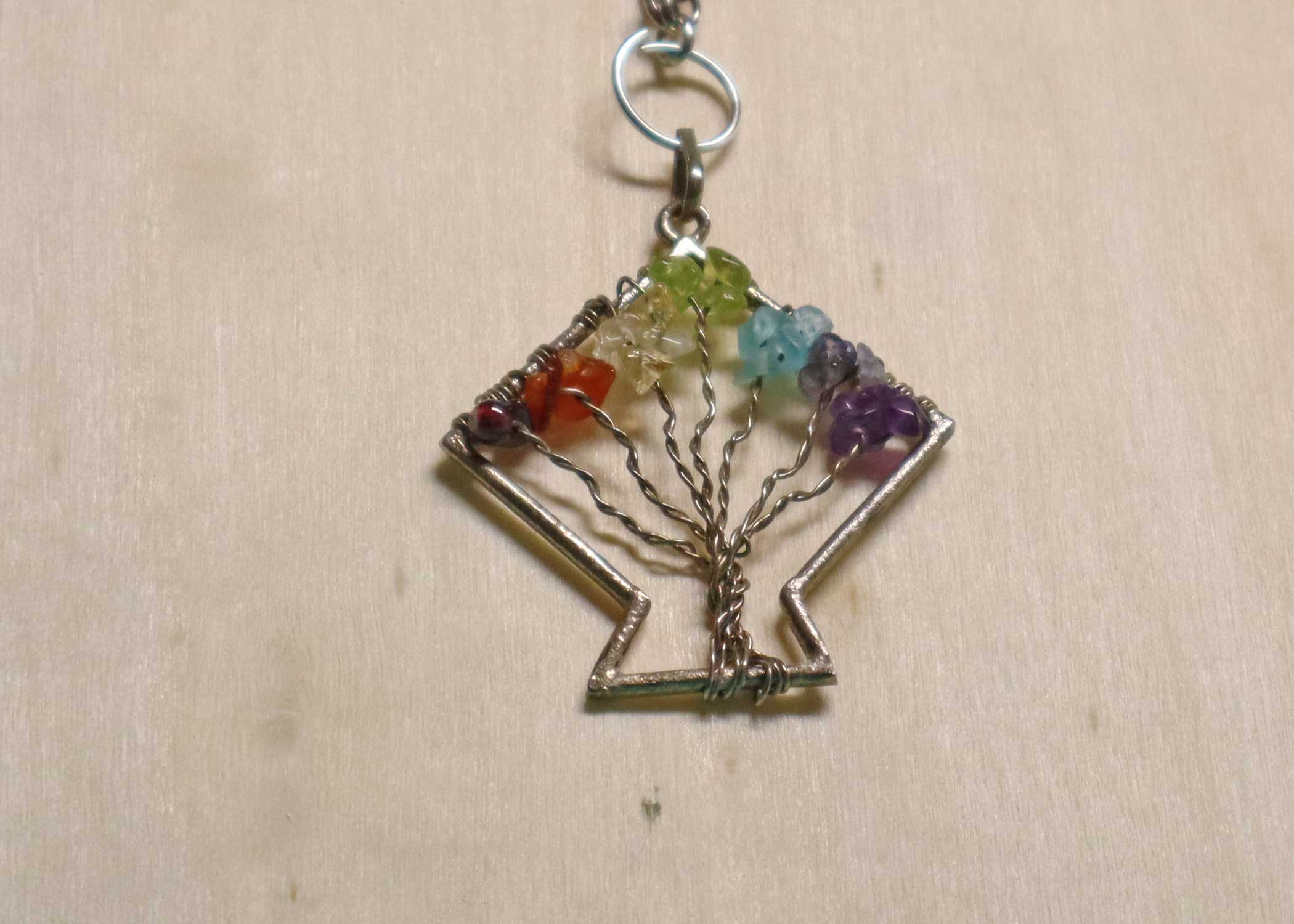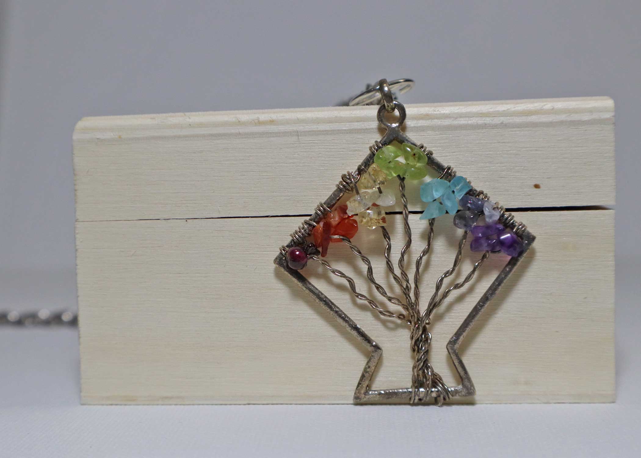 Associated with growth and strength, the tree of life is an universal symbol of interconnectedness of life forms. Chakra is a sanksrit word that means spinning wheel. representing the spinning vortex powerhouse if energy, this pendant combines the tree of life with the 7 Chakra natural stones that represent a specific area of the body which inturn relates to different aspects of the consciousness of life. The pendant provides a vessel for maintaining the balance of chakras which is essential for the physical and spiritual well being. The 7 Chakra Tree of life helps in maintaining a balanced emotional, mental and physical wellbeing. carnelian, blue agate, amethyst, red jasper, green jade, yellow agate and clear quartz are used in the pendant. This provides grounded dynamic energy, balances emotions and harmoniously aligned chakras.